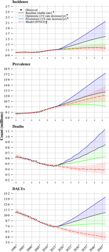 και ακόμη πιο μελανές μέχρι το 2047 στις εκτιμήσεις για την ευρωπαϊκή ένωση όπως φαίνεται την εικόνα 3, που αποτυπώνει τα ιστορικά δεδομένα και τις εκτιμήσεις για την συχνότητα της πάθησης, τα νέα περιστατικά που εμφανίζονται και επίσης η επίπτωση στην ποιότητα ζωής μετρημένη ως WHO disability-adjusted life years (DALYs)